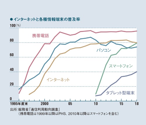 このように「インターネットこそ革命である」というのが同時代の空気として濃厚にありました。ところが、現実にはインターネットの本格的な普及にはさらに10年を要しました。総務省から毎年発表される「通信利用動向調査」を見てみましょう。インターネットは短期間で爆発的に普及したというよりも、数年かけて徐々に普及し、そしてある時点で伸び悩みのフェーズに入ったことが分かります。