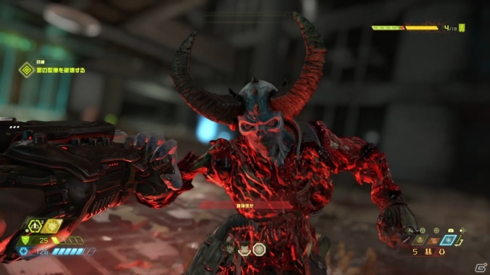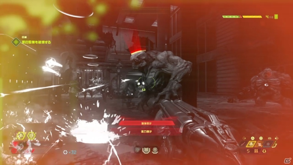 スレイヤーはメインウェポンだけでも最終的には8種類が使えるようになり、そのほとんどに機能を拡張する「武器MOD」が2種類用意されている。ひとつ例に挙げるなら、「ヘビーキャノン」は連射力に優れた武器だが、MODを取り付ければ遠くにいるデーモンを狙い撃つ強力な一撃や、誘導ミサイルも放てるようになる。これらの攻撃手段に加えて、チェーンソー、火炎放射、グレネードにアイスボム、終盤ではほとんどのデーモンを一撃で斬り伏せる大剣なども使えるようになり、とにかく選択肢が多い。