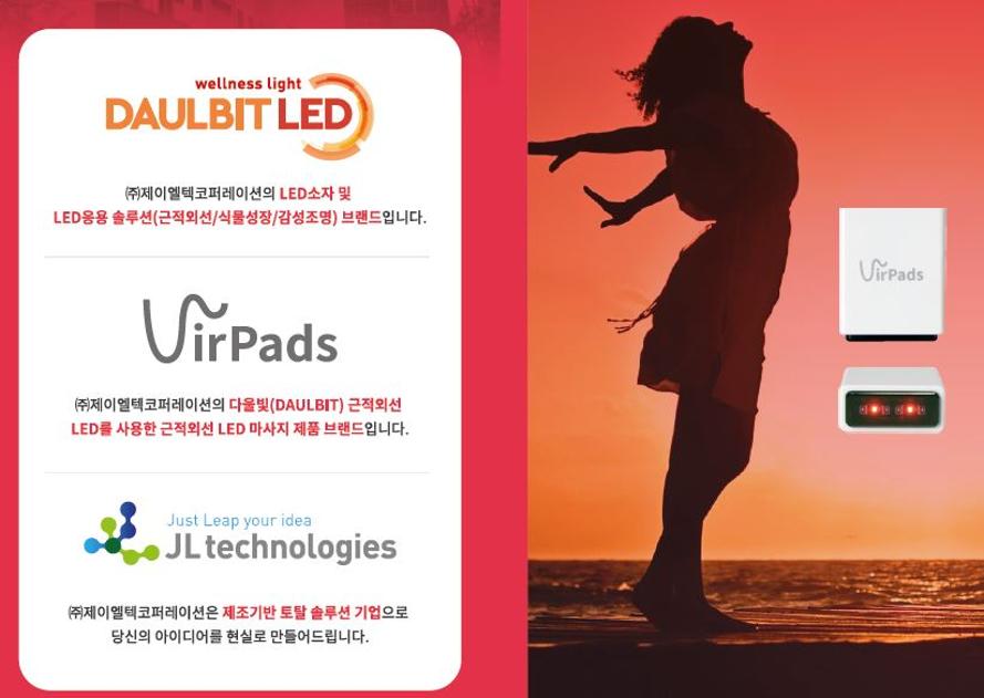 그는 "근적외선 관련 전문기기를 개발하기 위해 본사에 '다울빛 LED(DAULBIT LED)' 브랜드를 마련했고 여기에 LED를 사용한 근적외선 마사지 제품브랜드인 '버패즈(VirPads)'를 개발하게 됐다"면서 "버패즈에는 소형기기부터, 다목적기기, 피부전용 기기, 3파장 마스크 등 다양한 라인업으로 구성돼 있어 눈과 피부, 목, 손목, 무릎 등 신체 부위를 마사지할 수 있다"고 소개했다.