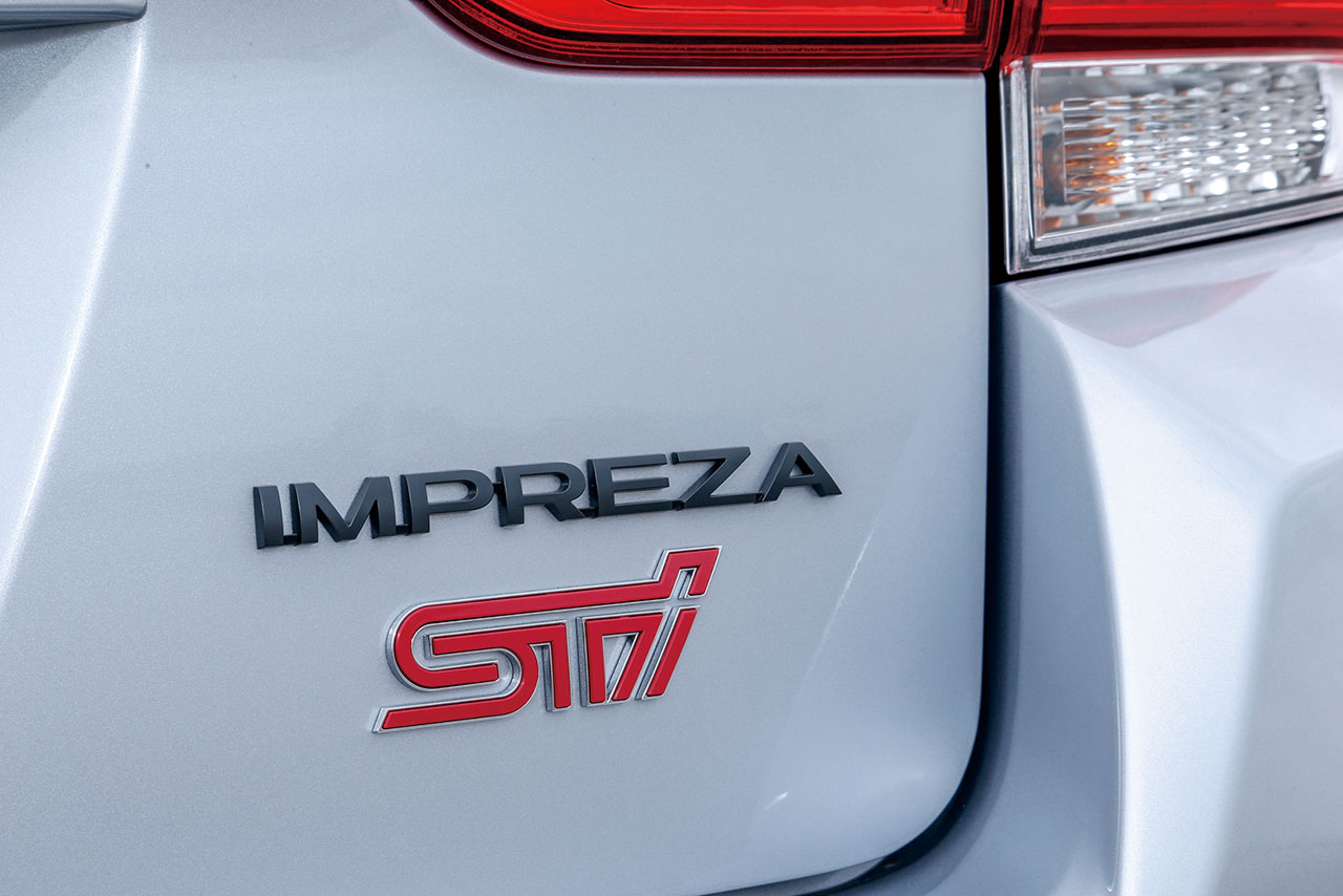 チェリーレッドのオーナメントが高性能モデル、「STI」であることを主張。IMPREZAやシンメトリカルAWDのリヤオーナメントは専用のラスターブラックに。