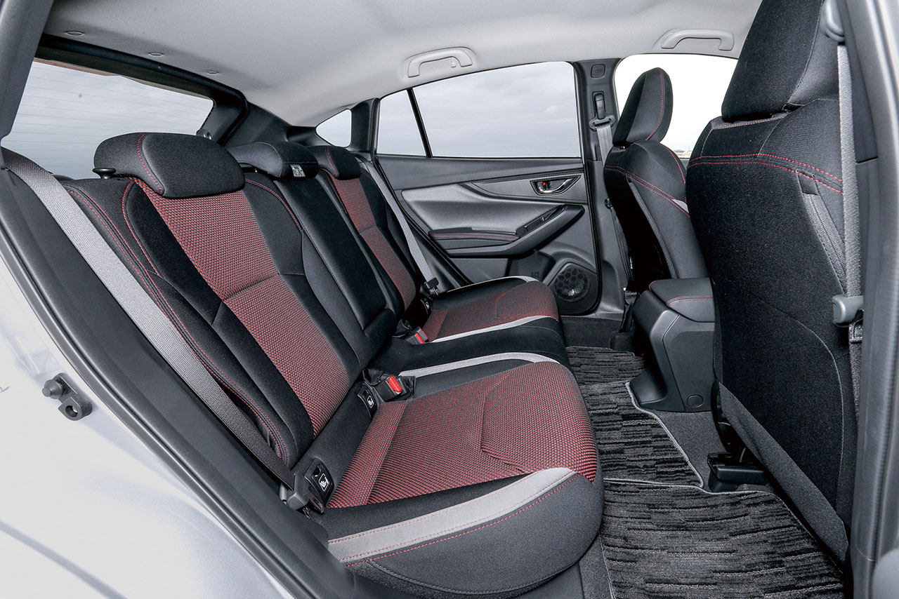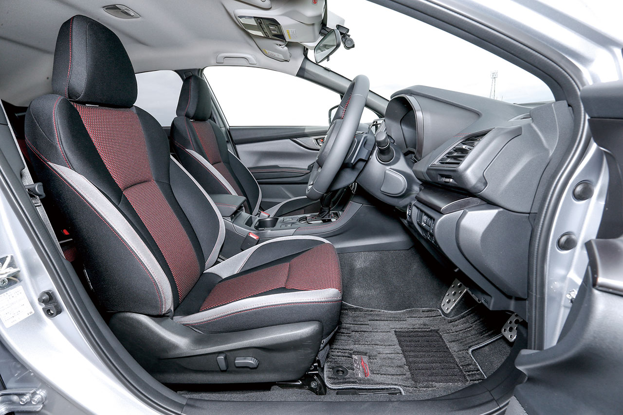 ファブリック/トリコットシートはブラック、レッドにライトグレーを組み合わせた配色。ピアノブラックの加飾などで、スポーツに寄りすぎず上質な印象だ。