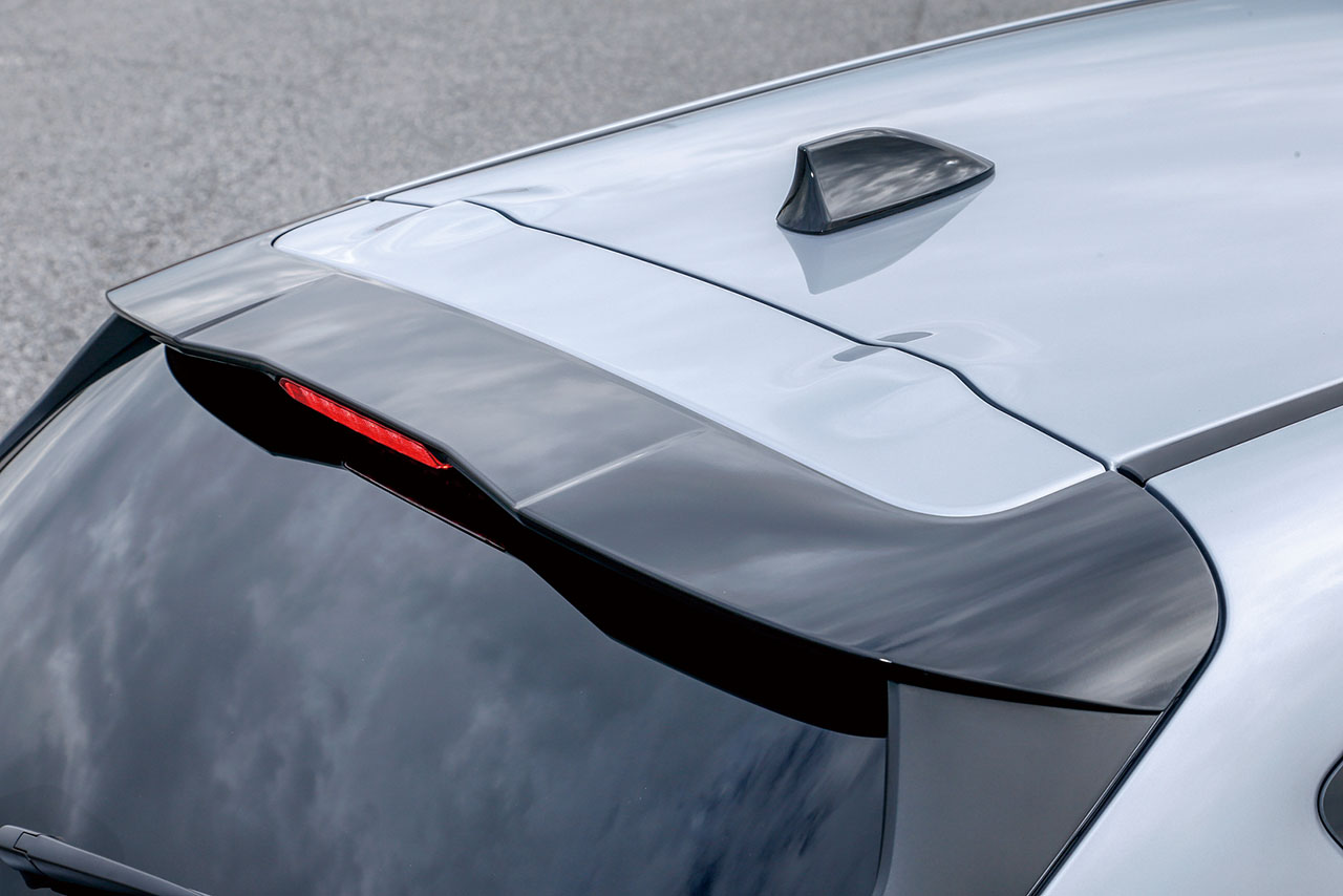 グリル、フォグランプカバー、ルーフスポイラー、シャークフィンアンテナやドアミラーなど各部をブラックに。18インチアルミホイールもダークメタリック塗装の専用のもの。
