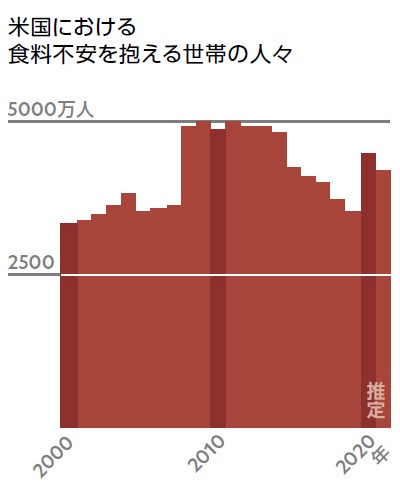 2020年に食料不足に陥った米国人の数は、それまでの減少傾向から転じて、劇的に増えた。米国人の7人に1人が食料不安、つまり栄養価の高い食料を十分に入手できない状態に置かれたと推定される。2021年3月にフィーディング・アメリカが発表した予測によれば、今年はわずかながら改善が見られ、食料不安に陥る人口は米国民の8人に1人に当たる4200万人となる見込みだ。この数字には1300万人の子どもが含まれる。つまり、今年は6人に1人の子どもが十分な食事をとれないかもしれないということだ。全米各地で食料の配布を求めて人々が長い車列を作る光景は、米国が長年抱えてきた問題を浮き彫りにした。これはパンデミックのせいで生まれた問題ではなく、パンデミックによって悪化した問題だと、フィーディング・アメリカのCEOクレア・バビノー゠フォントゥノは話す。